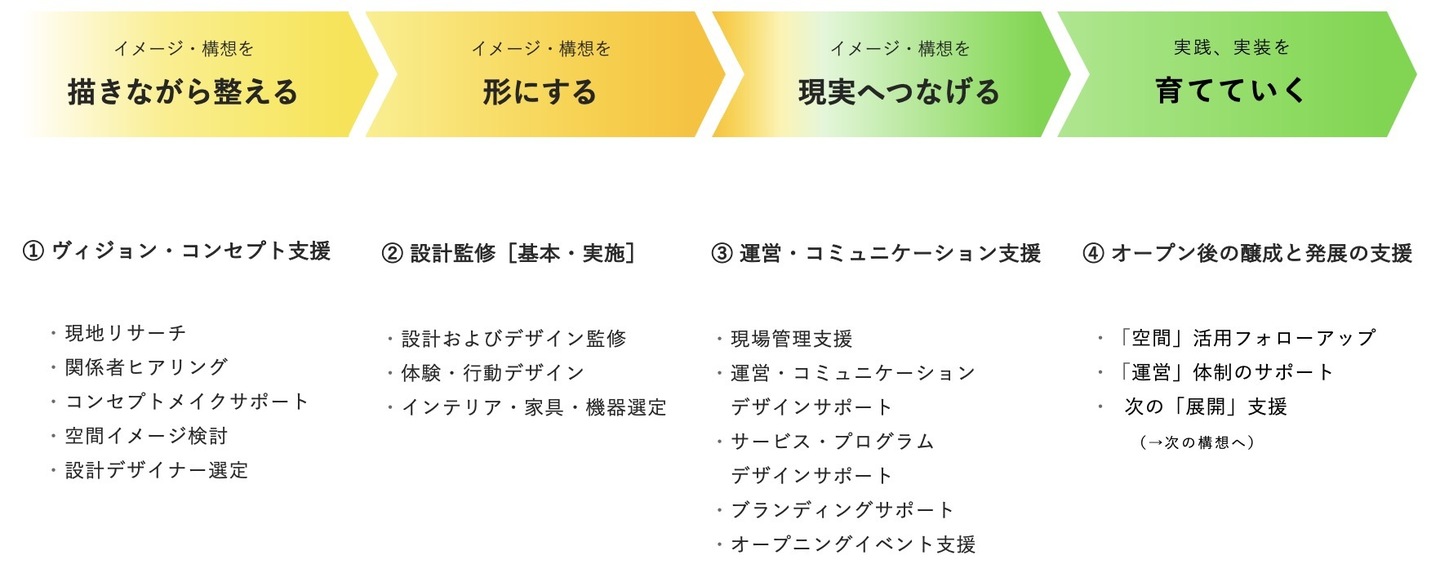 建築や設え(ハード)、日常のふるまいやサービス(ソフト)、そして人と人の関係性(コミュニケーション)。それらを一体として捉え、敷地条件や事業計画、関わる人たちの想いを読み解きながら、共有できる言葉に翻訳していきます。さらに、運営の仕組みやルールにまで落とし込み、その場所にあるはべき居心地や能動性を持った設計デザインを行っていきます。