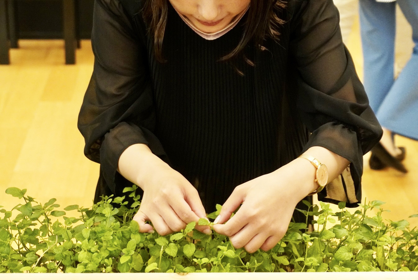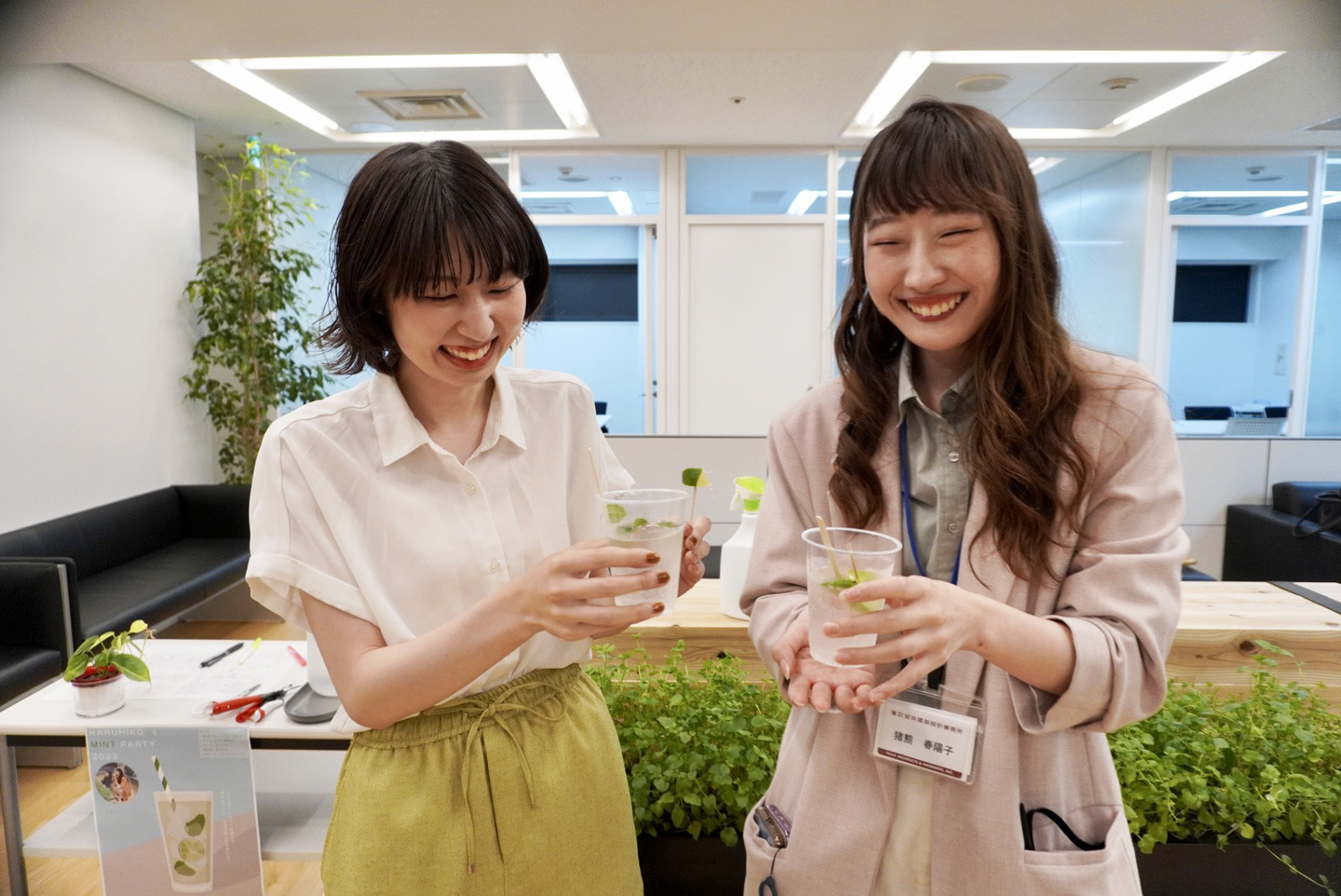 “誰もがいられる自由な場所”を実際に機能させることは、本当に難しい。弊社はまず竣工までの約1年をかけて、旧事務所のロビー空間を活用した社内イベントを継続的に開催していった。どうしてもスタッフがオフィスワーカー然としてしまう都会のオフィスでありながら、1階という多様な人々を受け容れる場となるために、スタッフがオフィスワーカーとは別の個性を安心して表せるよう、コミュニケーションの質を高めることがその目的だ。 弊社のノウハウを伝えたり、模型を囲んでクロストークをしたり、そうした活動の現場では飾り付けや、家具、ツールなどを活用した空間のアレンジでモードチェンジを体感。社内部活であるミントの栽培と連動した飲食イベントなども企画、実施され、さまざまなアクティビティが弊社の段取りだけでなく社員の皆さんの手によって行われていくことを推し進めていった。