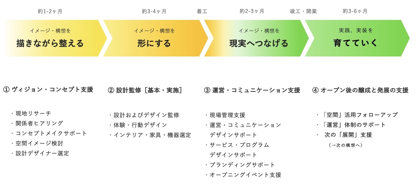 企画やコンセプトづくりから、設計・デザイン、 さらには運営・コミュニケーション・ブランディングまで。 一般的な設計事務所では分断されがちなプロセスを、 ひとつの流れとしてつなぎ、実践します。